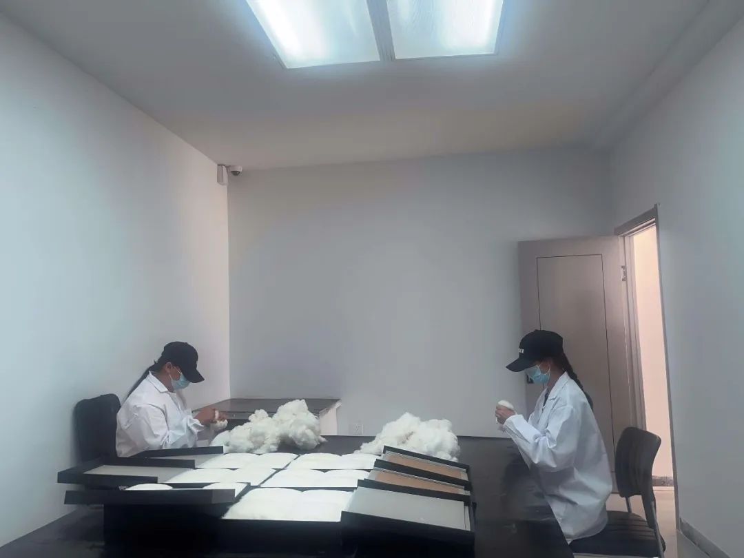 ▲庫車水控軋花廠棉檢員鐘丹、戚娜在崗進行棉檢技術練習。